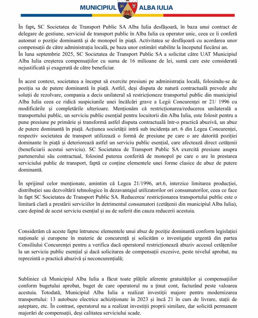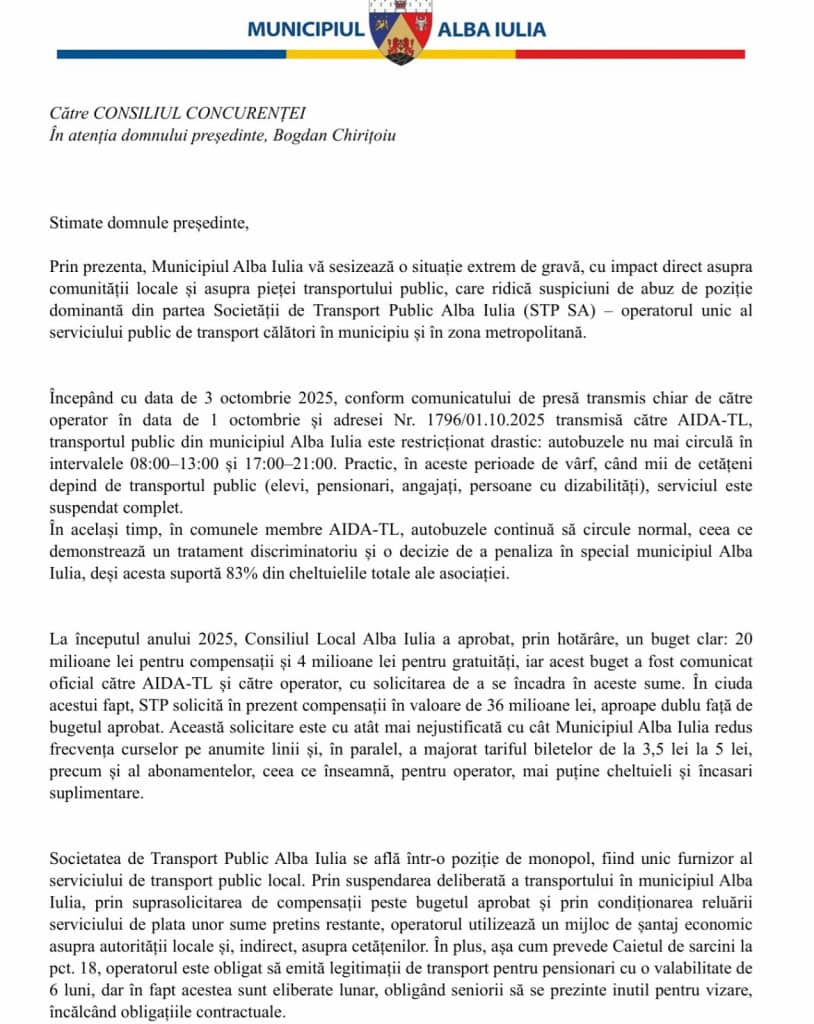 Prin prezenta, Municipiul Alba Iulia vă sesizează o situație extrem de gravă, cu impact direct asupra comunității locale și asupra pieței transportului public, care ridică suspiciuni de abuz de poziție dominantă din partea Societății de Transport Public Alba Iulia (STP SA) – operatorul unic al serviciului public de transport călători în municipiu și în zona metropolitană.