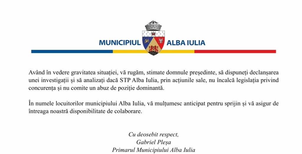 În numele locuitorilor municipiului Alba Iulia, vă mulțumesc anticipat pentru sprijin și vă asigur de întreaga noastră disponibilitate de colaborare”, se precizează în sesizarea către Consiliul Concurenței.