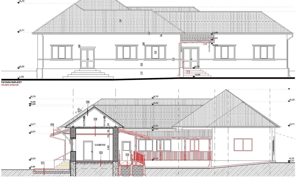 Accesul principal la fațada sud-estică a clădirii este alcătuit mai multe trepte care vor fi acoperite de o copertină nou propusă.