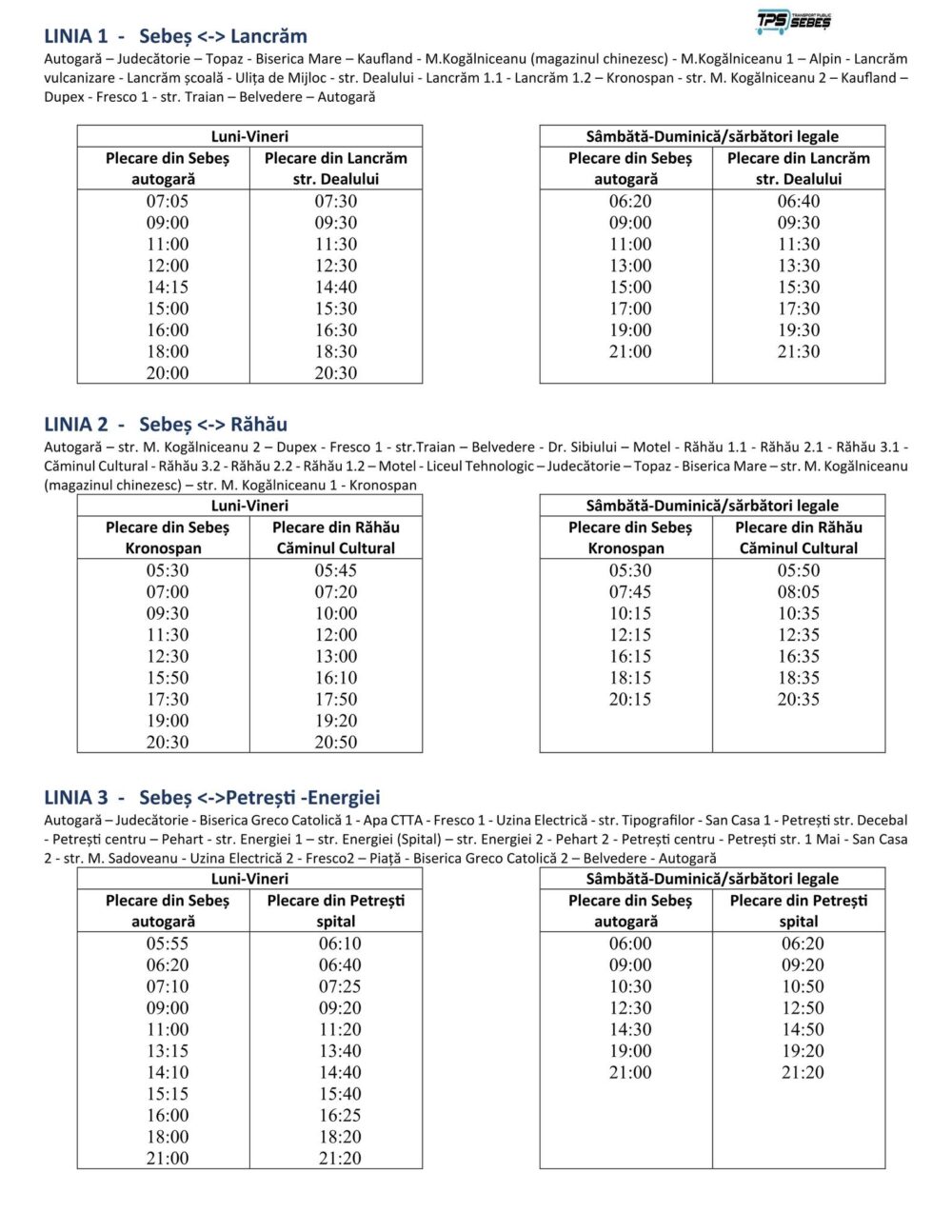 Programul autobuzelor de la Sebeș include trei linii principale operate de transportul public local din municipiu.