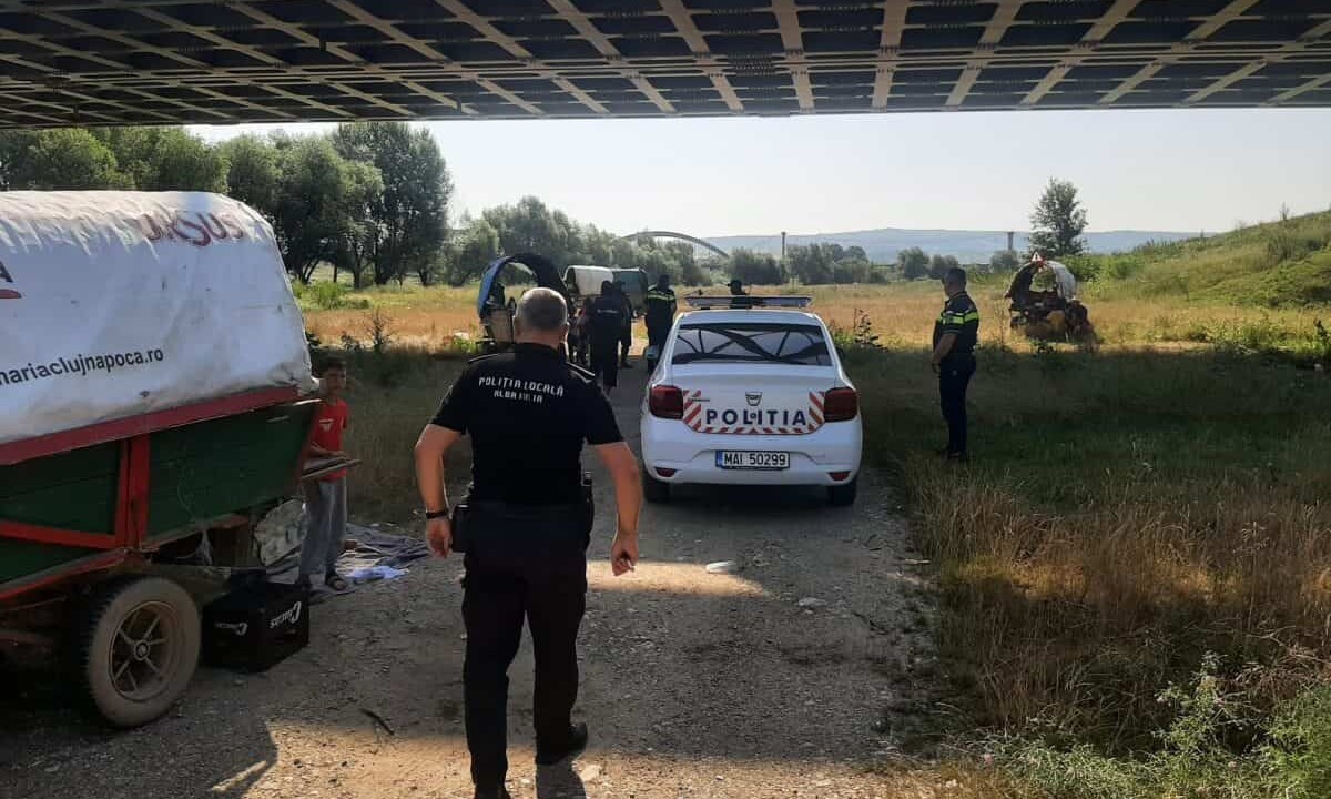 Razie a polițiștilor locali din Alba Iulia asupra unei tabere de nomazi instalată sub un pod. Căruțe, cai și animale domestice