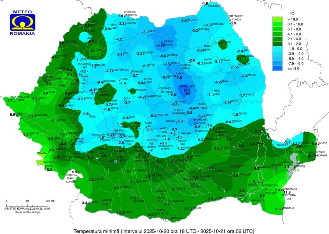 Record de temperatură negativă în România, în 21 octombrie, doborât după 76 de ani. Unde a fost cel mai frig