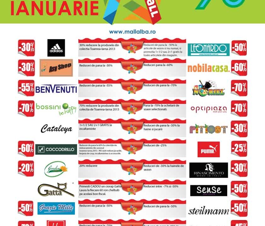 Reducerile aplicate de magazinele din Alba Mall în această perioadă, pornesc de la 20% la magazinele Mania și Garden și pot ajunge chiar și până la 70% la magazinele Bossini, Optiplaza, Jolidon, House of Art, Kenvelo și Noriel. Și magazinele Adidas, Benvenutti, Coccodrillo, Grazie Mille, Sense, Stone Creek, Nobila Casa, Puma, Mondex, vin în întâmpinarea clienților, cu reduceri semnificative de până la 60%, la diverse categorii de produse.