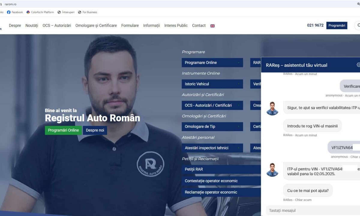 Registrul Auto Român (RAR) a lansat Chatbotul RAReş, cu ajutorul căruia publicul poate accesa mai uşor informaţii tehnice, precum data când expiră inspecţia tehnică periodică a maşinii, cum trebuie să procedeze dacă au pierdut cartea de identitate a vehiculului sau cum să obţină o programare într-o reprezentanţă.