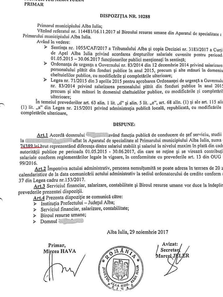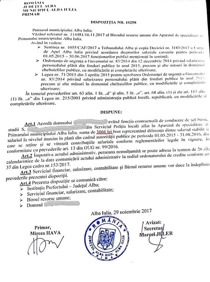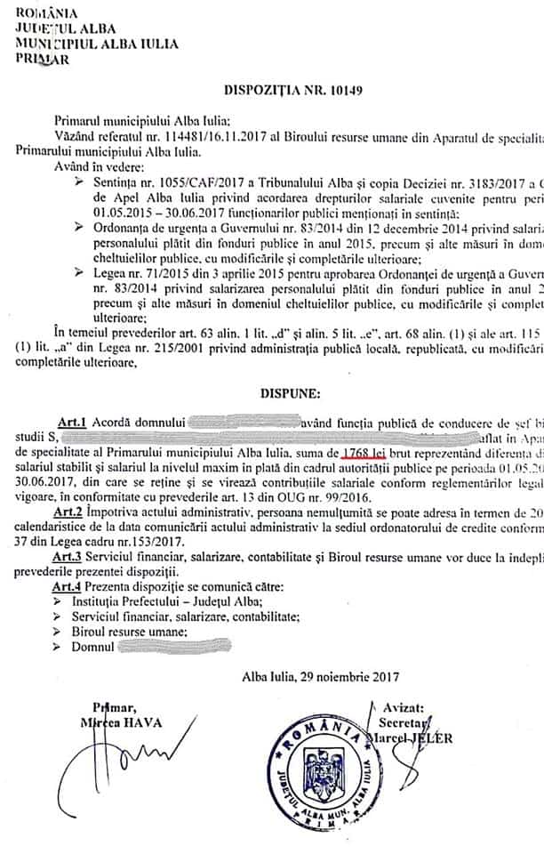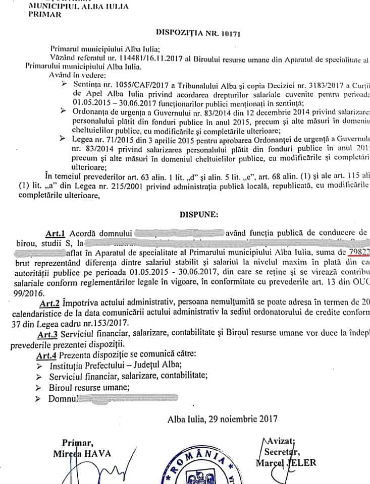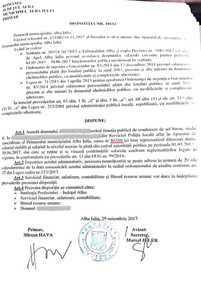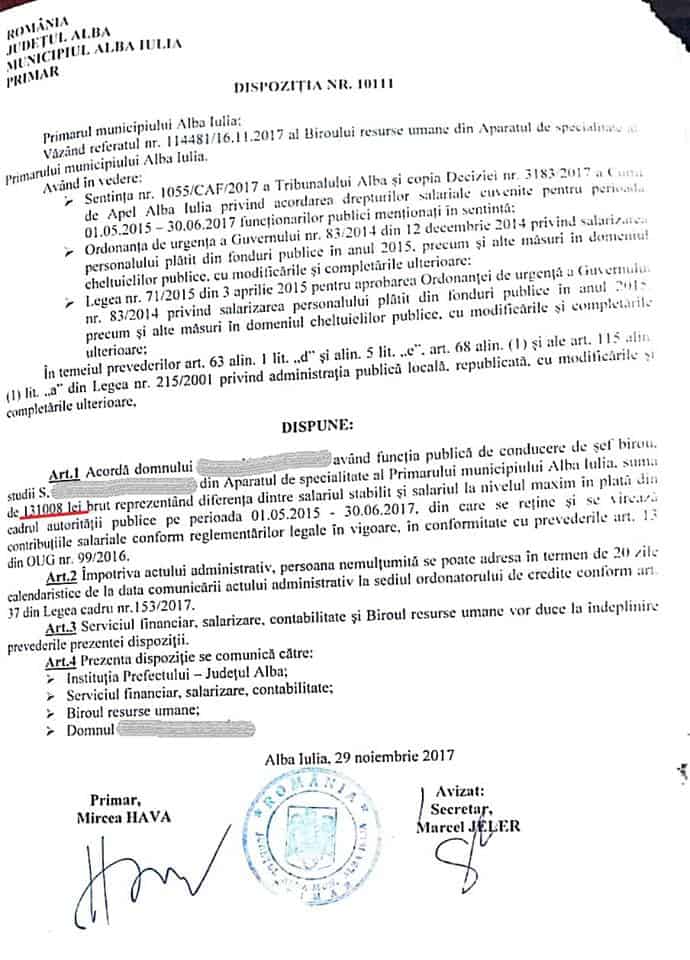 Curtea de Apel Alba Iulia a obligat primăria municipiului reședință de județ la plata unor sume colosale către proprii angajați, restanțe salariale neachitate la timp, potrivit legilor în vigoare. Este vorba despre sume care depășesc uneori 100.000 de lei de persoană, aferente perioadei 1 mai 2015 - 30 iunie 2017. De exemplu, un șef de birou din aparatul de specialitate al primarului Mircea Hava, are de recuperat 131.008 lei, iar un șef de serviciu, 105.000 de lei. Un șef de birou din cadrul Poliției Locale, are și el dreptul legal la peste 85.000 de lei. Ceva mai puțin primeasc alte categorii de angajați.