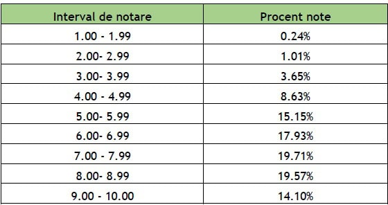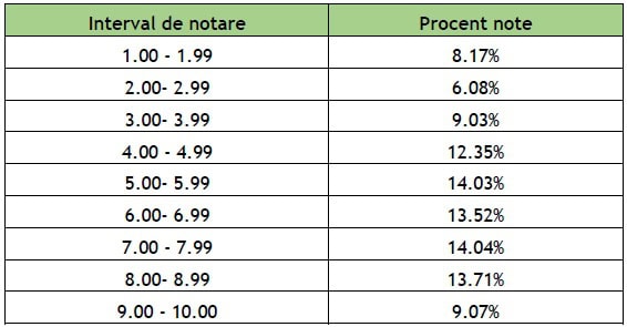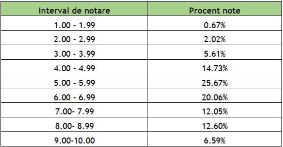 Potrivit rapoartelor statistice furnizate de platforma informatică, la momentul comunicării acestei sinteze se înregistrează următoarea situație pe probe și tranșe de note:
