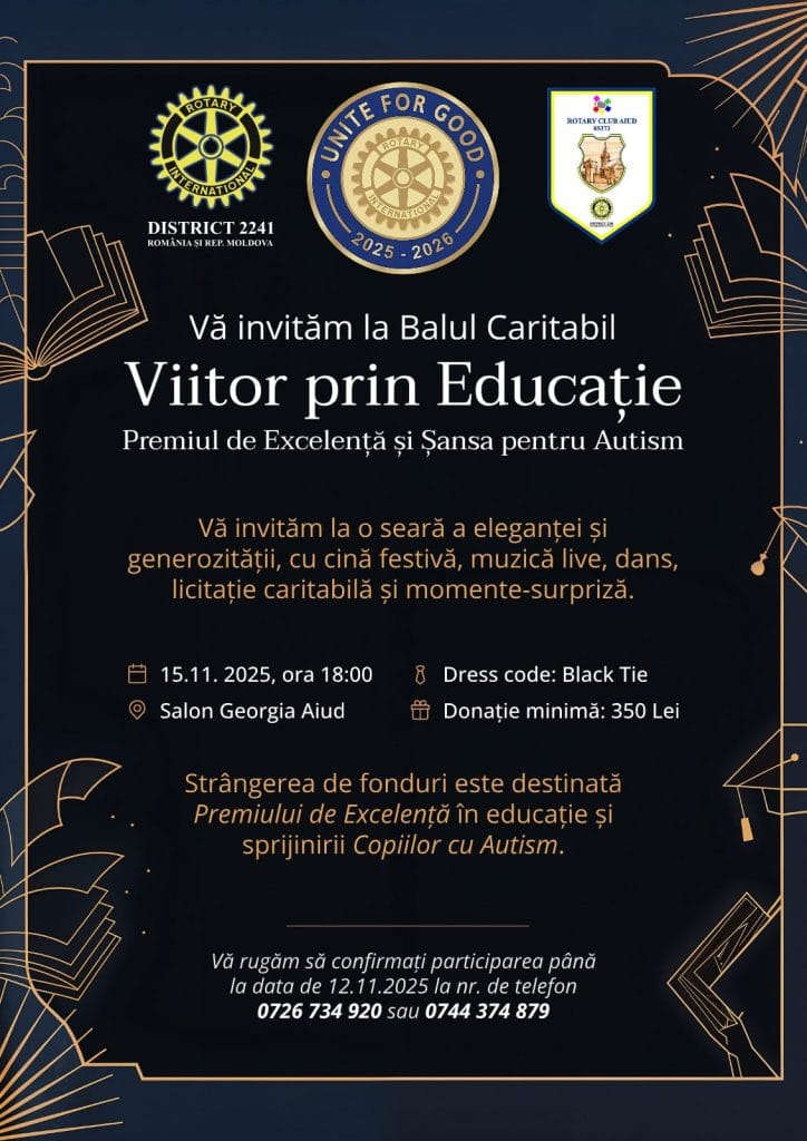 Sub deviza „Unite for good”, Rotary Club Aiud are deosebita plăcere de a anunța organizarea Balului Caritabil „Viitor prin educație – Premiu de excelență și șansă pentru autism”, un eveniment de excepție dedicat educației și sprijinirii copiilor din comunitatea locală, în special a celor cu autism.