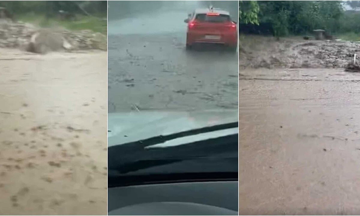 În video se vede drumul acaparat de ape, iar ploaie torențială pare că nu se mai oprește.