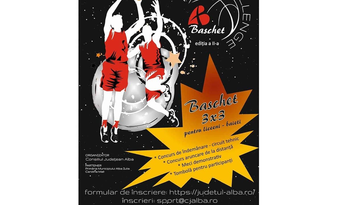 La Alba Iulia are loc sâmbătă, 12 octombrie, cea de-a doua ediție a turneului de Streetball 3x3 „Alba Baschet Challenge” pentru liceeni - masculin. Organizatorii au pregătit pentru cei prezenți mai multe surprize, între care un concurs de îndemânare, aruncări de la distanță, un meci demonstrativ electrizant și o tombolă cu premii.