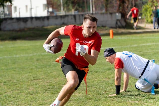 Flag footballul este o formă spectaculoasă de fotbal american, dar fără placaje. Jucătorii poartă o centură cu stegulețe („flags”), iar în loc să se lovească pentru a opri adversarul, trebuie să îi smulgă unul dintre stegulețe.