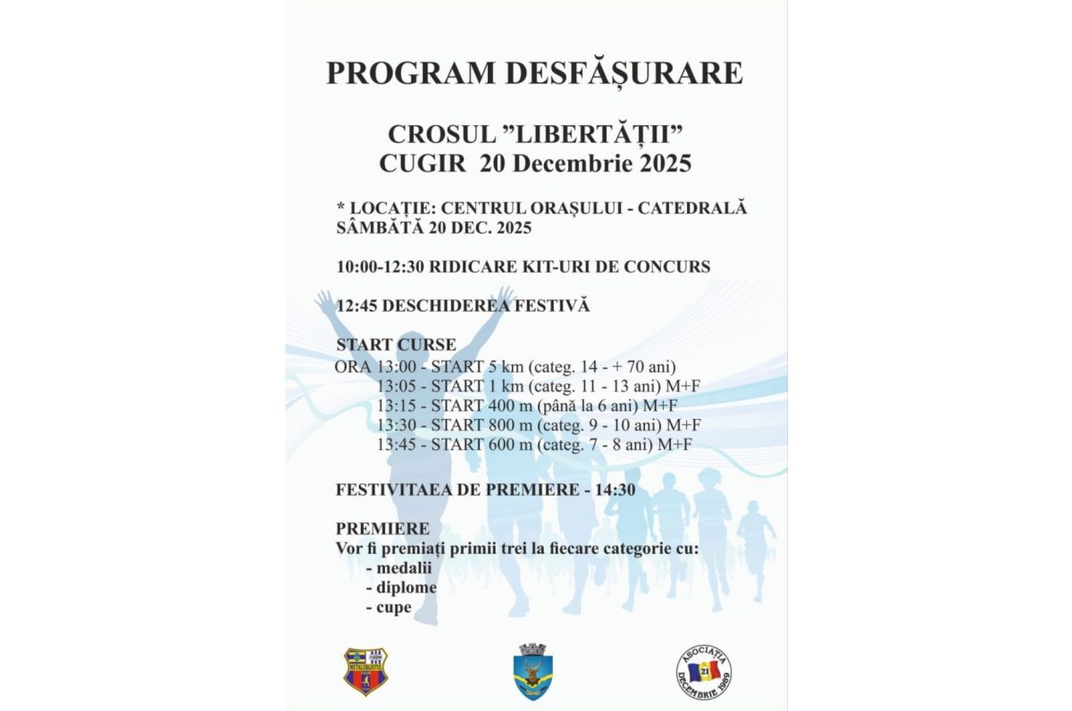 Peste 300 de alergători vor lua startul sâmbătă, 20 decembrie, în cadrul competiției Crosul Libertății de la Cugir. Evenimentul este dedicat spiritului de libertate, comunității și valorilor sportive.