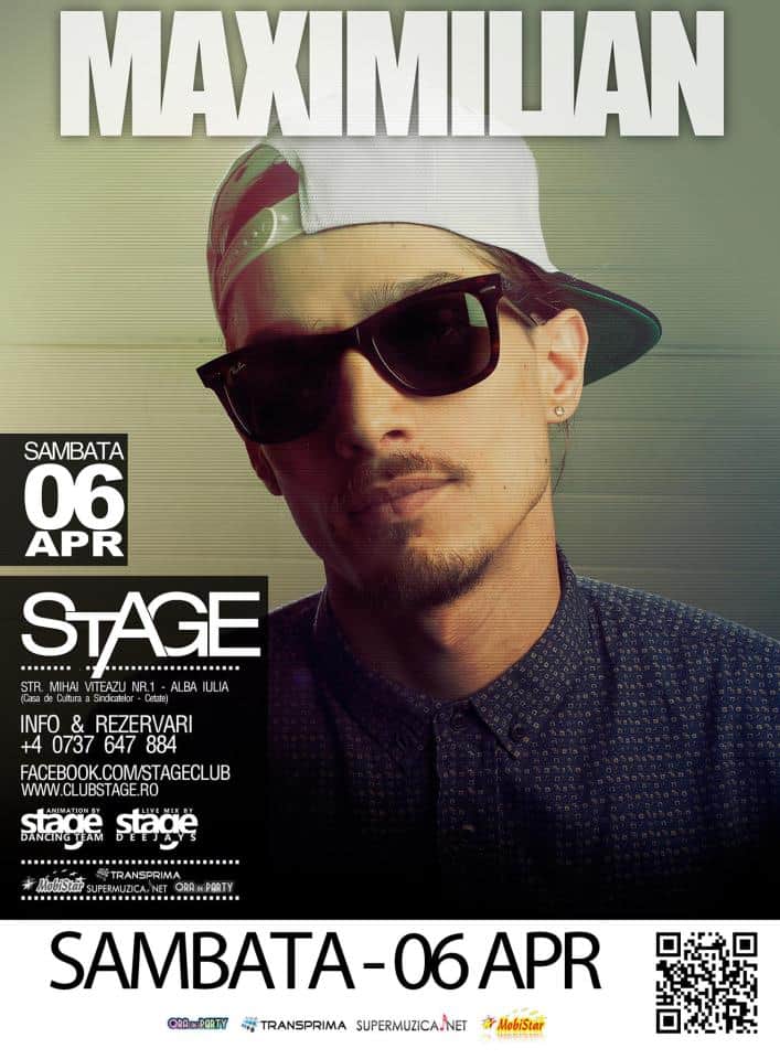 Club Stage ți-a pregătit și în acest sfârșit de săptămână o super petrecere și bineînțeles un super concert. Maximilian vine la Alba Iulia pentru a oferi petrecăreților cel mai tare show din acestă sâmbătă. „Domnișoare”, „Like A Boss” sau celebra „Sophie” sunt doar câteva dintre piesele care vor încălzi atmosfera. De asemenea, Club Stage a pregătit barul cu cele mai bune oferte.