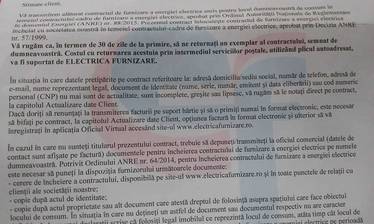 Transmiterea noului contract de furnizare a energiei electrice de către Electrica Furnizare este o acțiune legală derulată în baza Ordinului ANRE 88/2015, cu termen de finalizare 30 septembrie 2017, care vizează clienții casnici și noncasnici gestionați în piața reglementată.