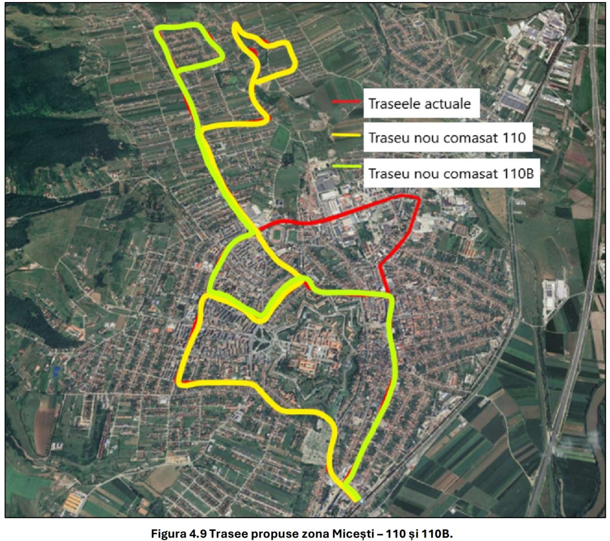 - Linia 110: Traseul propus (tur–retur identic): Micești Groape – Orizont – Moților – Hotel Cetate – Cloșca – Sf. Ecaterina – Încoronării – Gară