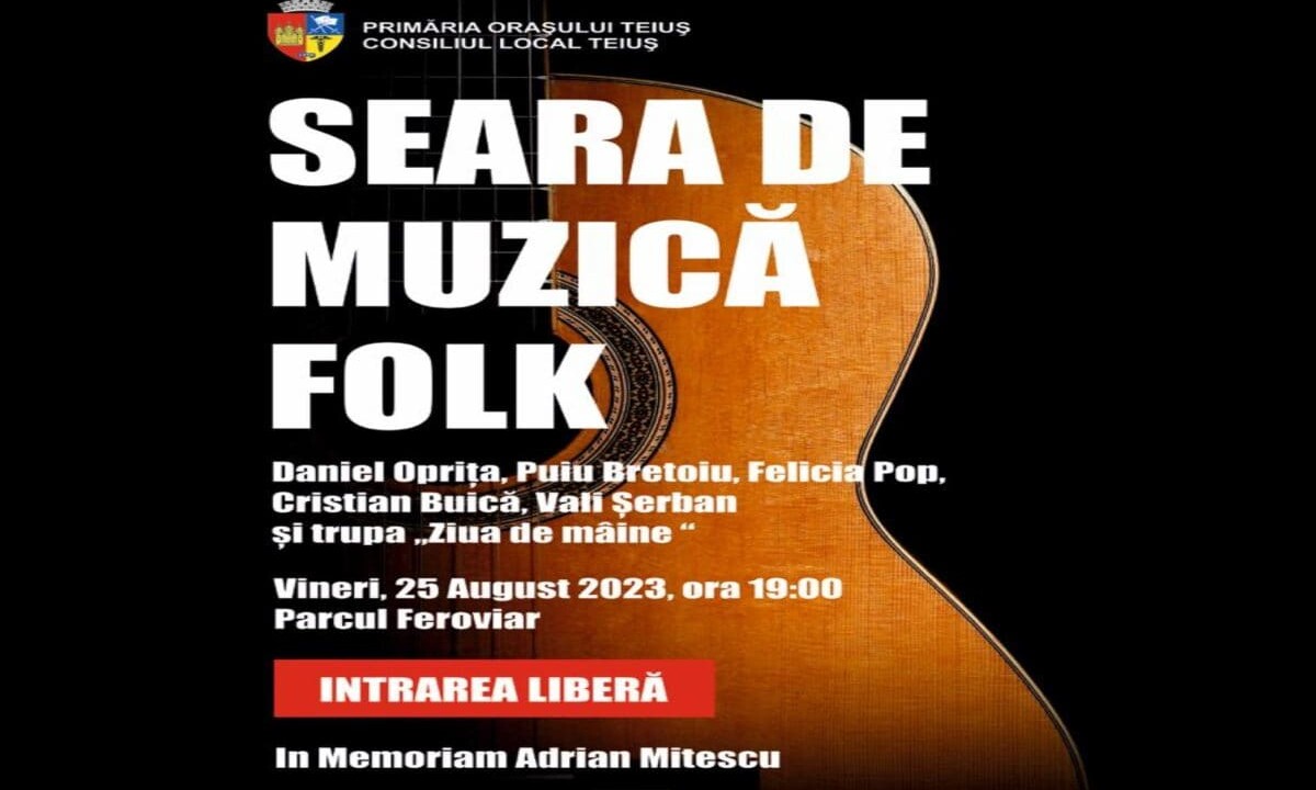 Primăria Teiuș organizează o seară de excepție pentru iubitorii de folk. Evenimentul se numește chiar așa: ”Seară de Muzică Folk” și va avea loc vineri, 25 august 2023, de la ora 19:00.