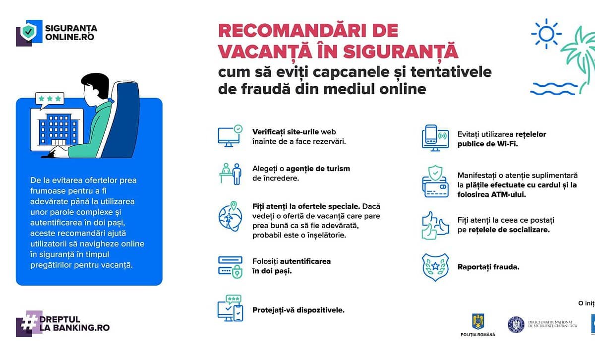 De la evitarea ofertelor prea frumoase pentru a fi adevărate până la utilizarea unor parole complexe și autentificarea în doi pași, aceste recomandări ajută utilizatorii să navigheze online în siguranță în timpul pregătirilor pentru vacanță:
