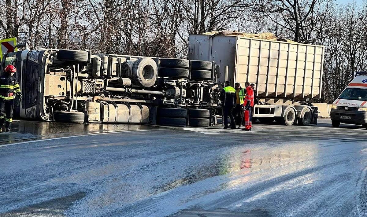 La misiune s-a acționat cu o autospecială de intervenție, iar în eveniment a fost implicat un autocamion care s-a răsturnat pe partea carosabilă.