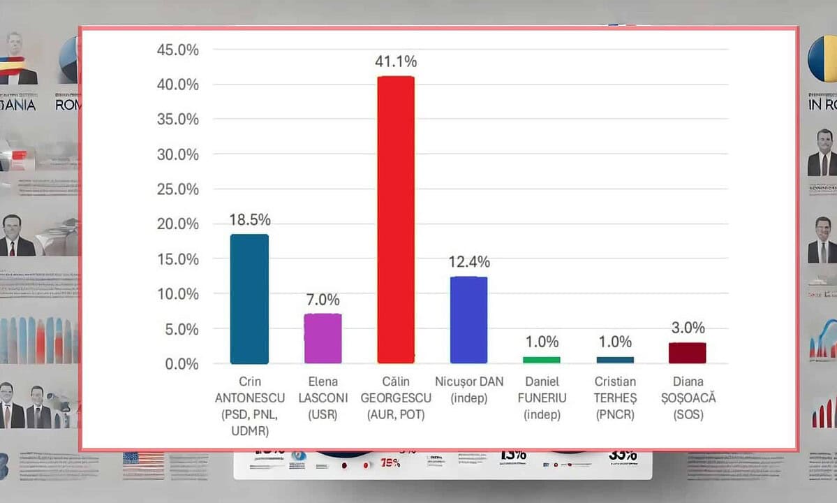 Potrivit sondajului, 58% dintre români au declarat că vor merge la vot. 41% dintre ei ar vota cu Călin Georgescu, 18,5% cu Crin Antonescu, 12,4% cu Nicușor Dan și abia 7% cu Elena Lasconi.