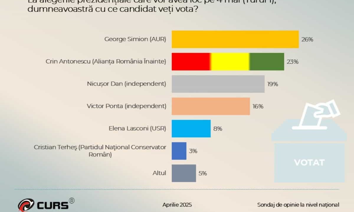 Sondaj CURS alegeri prezidențiale 2025: George Simion și Crin Antonescu, pe primele locuri. Schimbări după scandalul din USR
