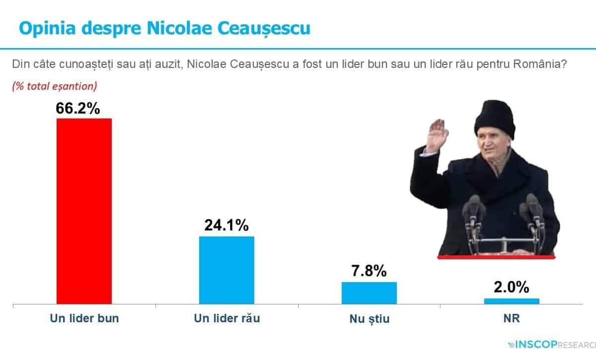 Și ca urmare a acestui eșec, astăzi două treimi dintre români cred că Nicolae Ceaușescu (de vreo 10 ani, veritabil star pe Facebook și Tik-tok în video-uri și imagini realizate profesionist și răspândite strategic și cu resurse) a fost un lider bun pentru Romînia, și doar 24% cred că a fost un lider rău pentru România.