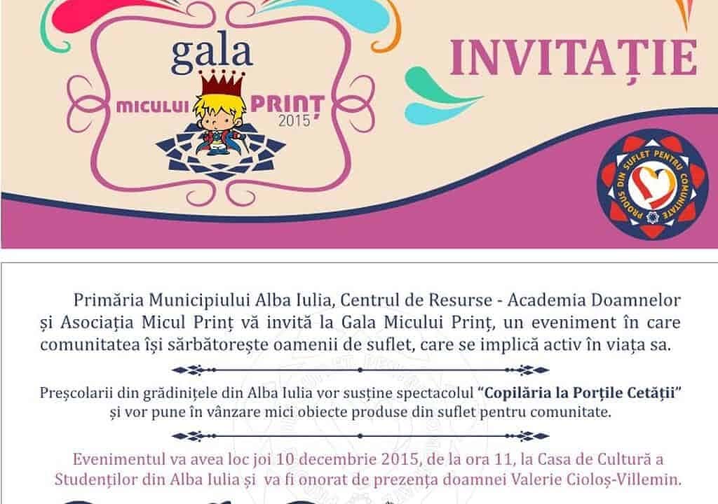 În cadrul Galei Micului Prinț, preșcolarii din grădinițele din Alba Iulia vor susține spectacolul „Copilăria la Porțile Cetății” și vor pune în vânzare mici obiecte produse din suflet pentru comunitate. La eveniment va participa și Valerie Cioloș-Villemin, soția premierului Dacian Cioloș.
