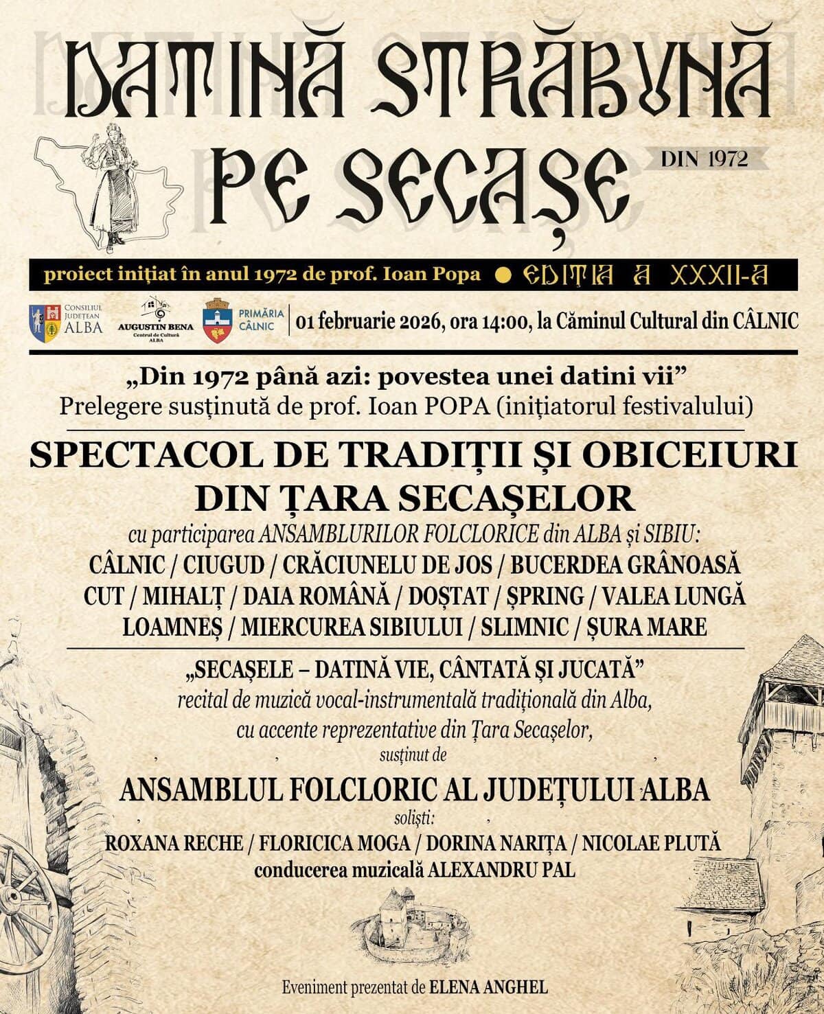 Spectacol de tradiții și obiceiuri din Țara Secașelor: Datină străbună pe Secașe, în 1 februarie, la Câlnic. Program