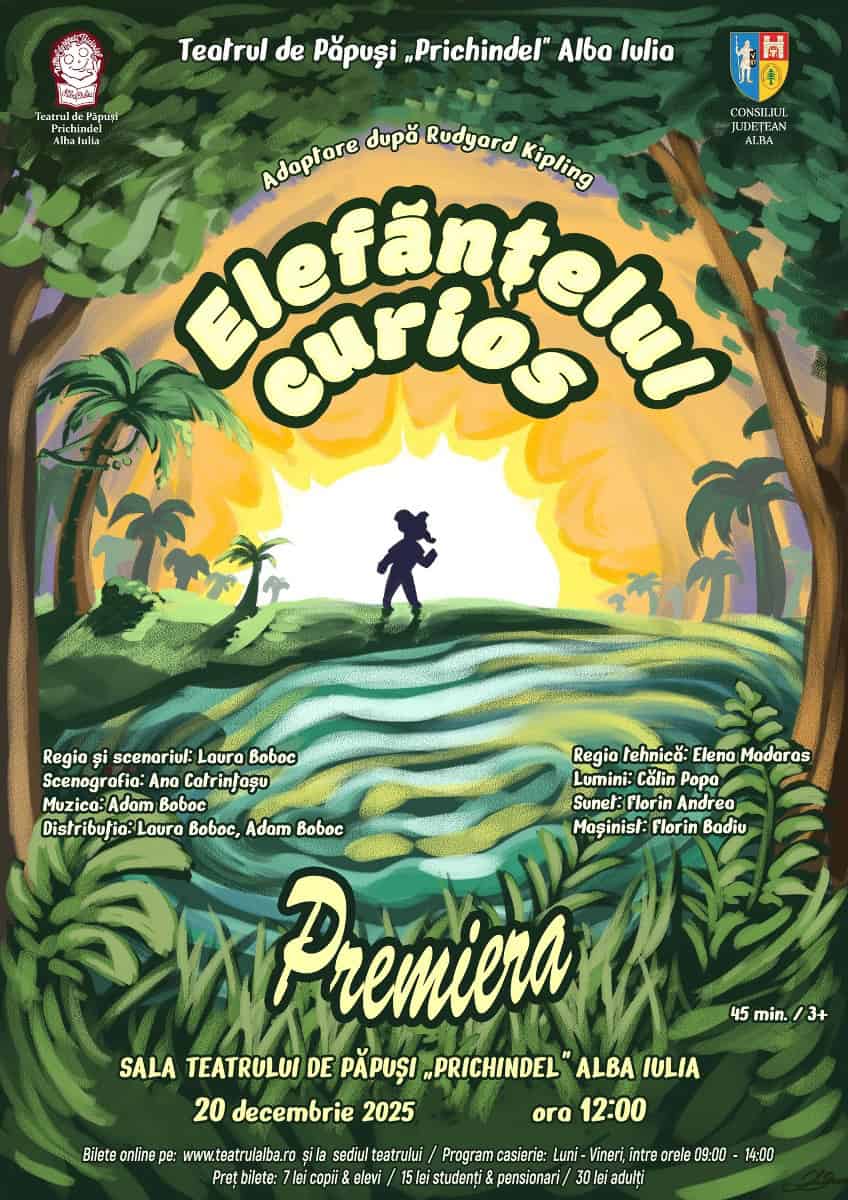 Teatrul de Păpuși „Prichindel” din Alba Iulia prezintă sâmbătă, 20 decembrie, de la ora 12.00, un spectacol-premieră. O adaptare a povestirii lui Rudyard Kipling, „Elefănțelul curios” este în regia Laurei Boboc.