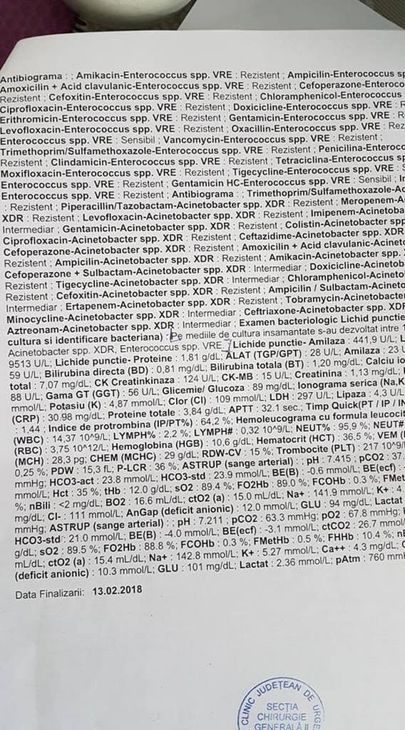 Dupa înmormântare am decis să aflu mai multe și am aflat ce ascundeau medicii, tatăl meu a murit de infecție nosocomială cu Acinetobacter Baummanii, o bacterie specifică sălilor ATI și cu o mortalitate de până la 75% (3 din 4 infectați cu această bacterie mor), iar după fișele medicale se pare că tatăl meu a fost infectat cam în data operației”, a povestit bărbatul.