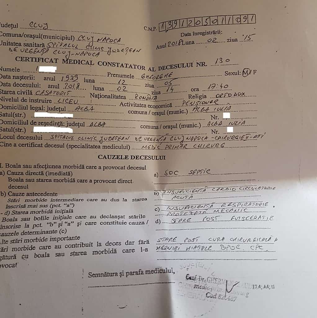 În toata perioada cât a stat în terapie intensivă am vorbit zilnic cu toți medicii ATI de gardă și cu chirurgul și am cerut zilnic detalii despre evoluția tatălui meu. Inclusiv în ziua morții nu am primit răspunsul adevărat cu cauza care a dus la deces. După resuscitare (inima s-a oprit în jurul orei 16:00, medicul de gardă ATI a ajuns în sală în jurul orei 16:30, chirurgul în jurul orei 17:00 și decesul a fost constatat la ora 17:40), doctorul ATI și chirurgul ne-au anunțat decesul și încercau pe ocolite să renunțăm la autopsie, pe motiv ca vom putea ridica mortul doar luni (decesul fiind miercuri).