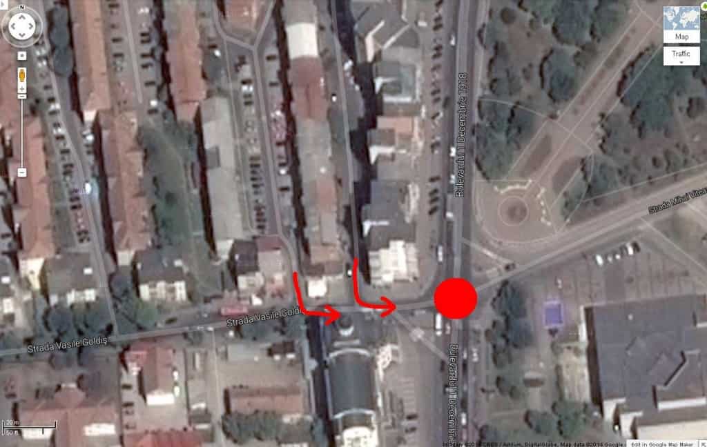 În primul rând, datorită sensului unic de pe Vasile Goldiş, toate maşinile sunt direcţionate într-un singur sens; dacă în intersectia Parc - Casa de cultură s-ar face un sens giratoriu, iar pe primele două străzi de după blocurile M-uri să se poată face la stânga, atunci nu ar mai fi atâta flux de maşini.