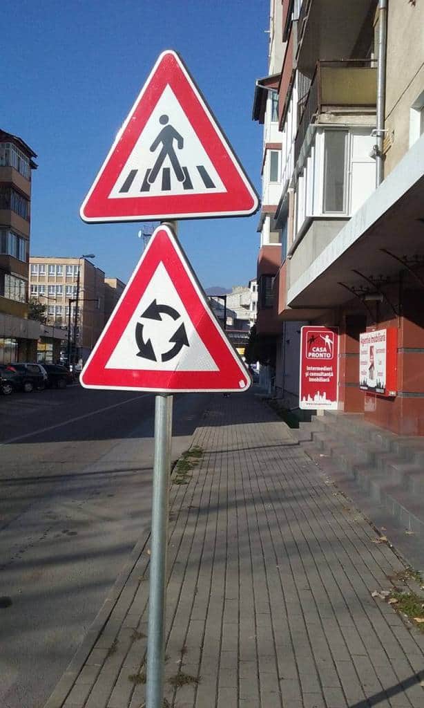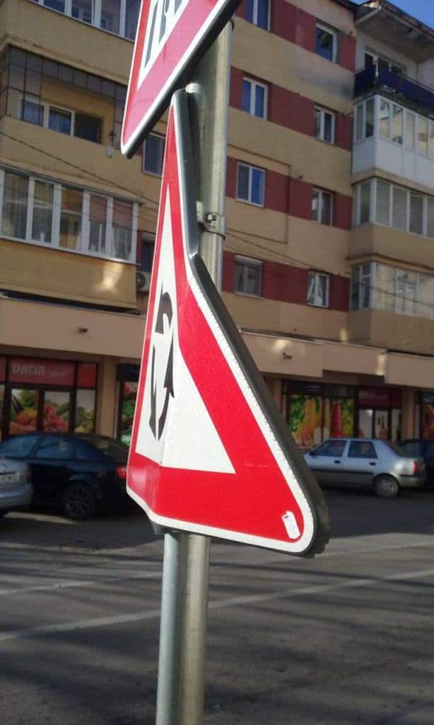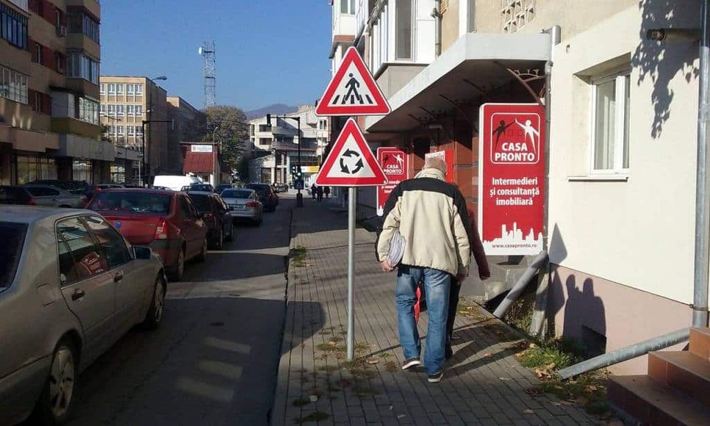 Pietonii neatenţi care circulă pe o stradă din Alba Iulia riscă să se trezească cu vânătăi, în cel mai fericit caz. Motivul este un indicator rutier montat "inspirat", pe trotuar.