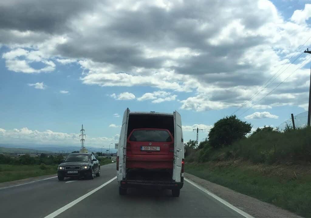 Pe imaginea suprinsă vineri, 10 iunie, de cititorul Alba24, se poate observa o autoutilitară a cărui șofer transportă, în interiorul acesteia, un autoturism marca Volkswagen Polo. Mașina a intrat „la milimetru” însă ușile autoutilitarei au rămas deschise, astfel ceilalți conducători auto care au circulat în spatele acesteia au putut vedea și fotografia isprava șoferului.