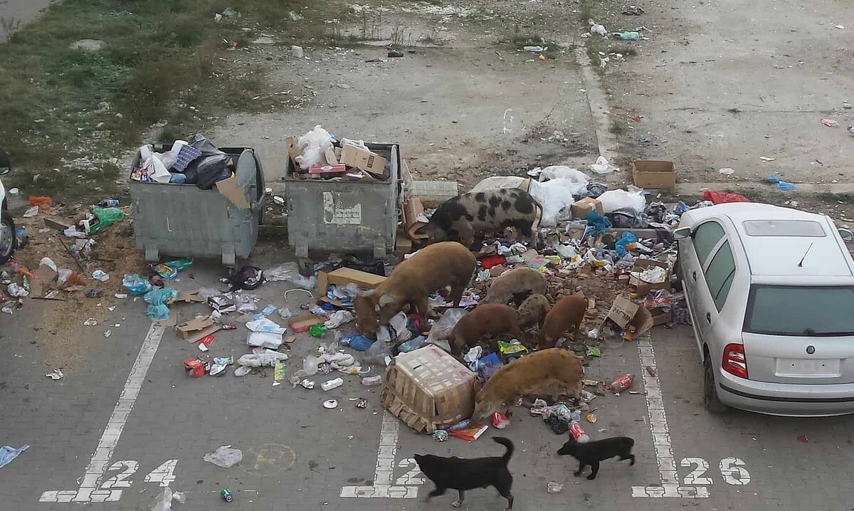Informația ne-a fost furnizată de un cititor Alba24.ro care a și trimis o fotografie realizată marţi dimineață, în care se vede o adevărată turmă de porci și doi câini care caută nestingheriți prin gunoaiele lăsate pe asfalt, pe două locuri de parcare.
