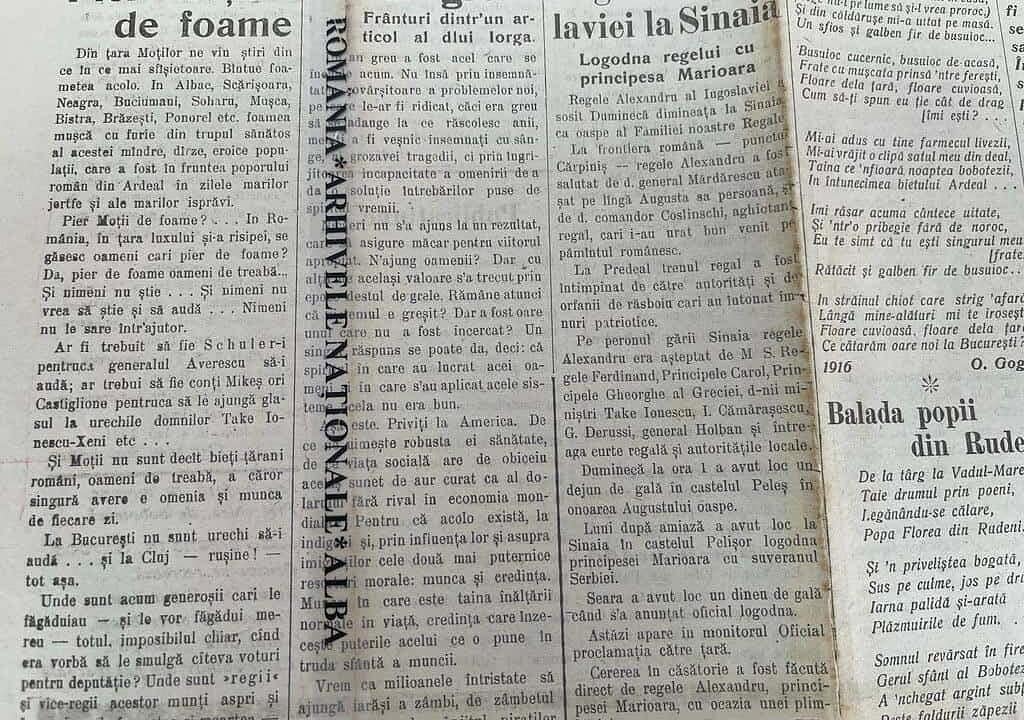 Într-un alt număr, reporterii au scris că Regina Maria a trimis 10 vagoane de porumb pentru moții înfometați.