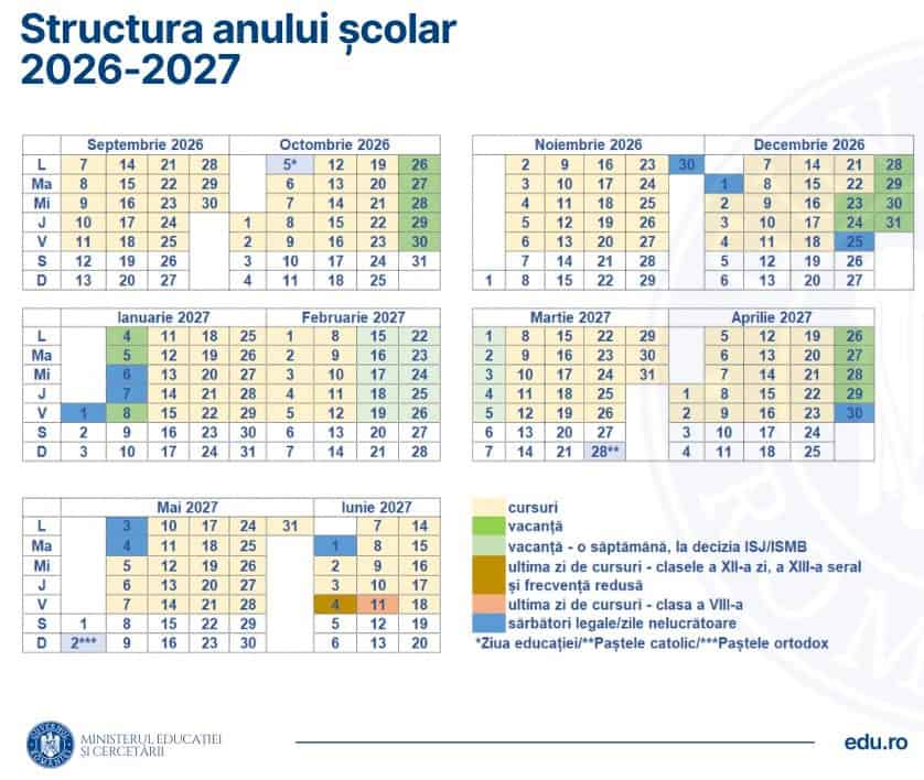 Astfel, anul școlar 2026 - 2027 va începe la data de 7 septembrie și va avea o durată de 36 de săptămâni de cursuri.