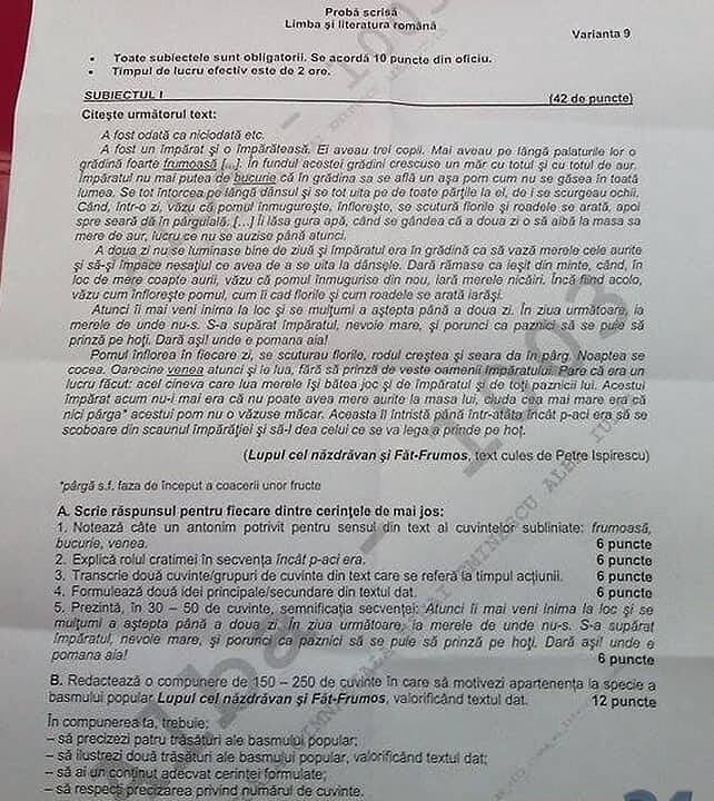 UPDATE: Luni, la primul subiect al evaluării la limba și literatura română, elevii au avut de rezolvat mai multe cerințe pe baza unui fragment din basmul lui Petre Ispirescu, „Lupul cel năzdrăvan și Făt-Frumos” de Petre Ispirescu. Tot la primul subiect, absolvenții de gimnaziu au avut de redactat o compunere de 150 — 250 de cuvinte în care să motiveze apartenența la specie a basmului popular „Lupul cel năzdrăvan și Făt-Frumos”, valorificând textul dat.