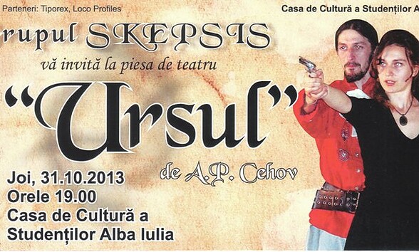 Joi, 31 octombrie, începând cu ora 19.00, la Casa de Cultură a Studenţilor din Alba Iulia, grupul Skepsis va oferi publicului spectacolul "Ursul", de A. P. Cehov. Evenimentul este organizat...