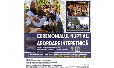 Sediul Consiliului Județean Alba din inima Cetății Alba Carolina găzduiește duminică, 27 octombrie, un eveniment cultural de excepție: finalizarea proiectului „Ceremonialul Nupțial. Abordare Interetnică”, inițiat de Centrul de Cultură ,,Augustin...
