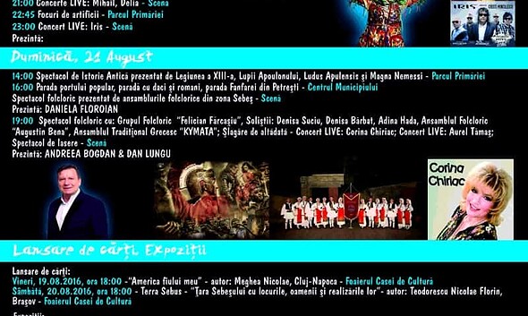19-21 august: Zilele Municipiului Sebeș. Trei zile de spectacole cu Adda, Delia, Mihail, Iris și alți artiști. PROGRAMUL