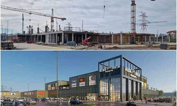 Se lucrează intens pe șantierul Alba Iulia Shopping City. Noul mall aflat în construcție în municipiul Alba Iulia urmează să fie deschis în luna septembrie 2023. O imagine - simulare...