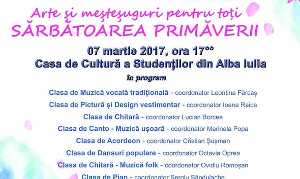 La Casa de Cultură a Studenților din Alba Iulia va avea loc marți, 7 martie, „Sărbătoarea Primăverii - Arte şi meşteşuguri pentru toţi”, eveniment în care vor evolua copii şi...