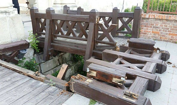 FOTO: Accident cu bicicletele pe dealul Cetății. O minoră și un bărbat au ajuns la spital după ce au rupt balustradele podului de la Poarta I