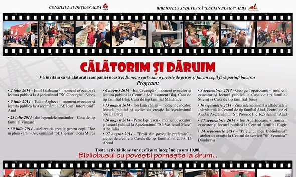 Luni, 4 august, de la ora 10.00, va avea loc o nouă sesiune de lectură publică şi animaţie culturală cu Bibliobusul Consiliului Judetean Alba, la Centrul de Plasament din Blaj....