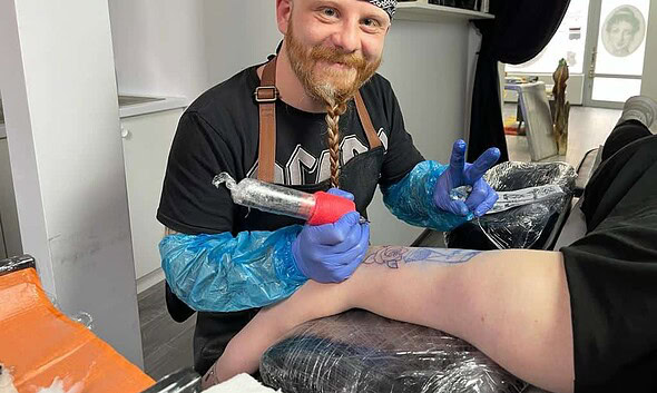 La o masă un bărbat cu înfățișare de viking, o bandană în cap și un tricou cu AC/DC stă aplecat și desenează niște linii fine pe hărtia de imprimare. Ridică...