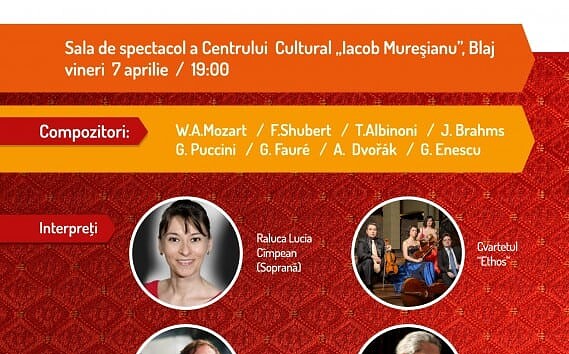 La Centrul Cultural „Iacob Mureșianu” din Blaj va avea loc vineri, 7 aprilie, un Concert de Paști susținut de soprana Raluca-Lucia Cîmpean, violonistul Dan Liviu Cernat, pianistul Ovidiu Pârjol şi...