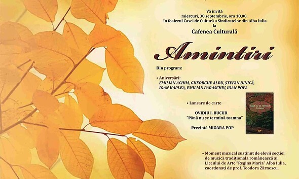 MIERCURI: „Amintiri” la „Cafenea Culturală”, în foaierul Casei de Cultură a Sindicatelor din Alba Iulia. Aniversări, lansare de carte și moment muzical