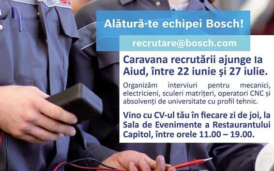 Compania BOSCH – Blaj (jud. Alba) organizează în perioada 22 iunie – 27 iulie, în fiecare zi de joi, sesiuni de interviuri în oraşul Aiud, prin care vizează promovarea oportunităţilor...