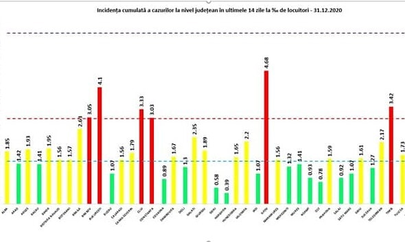 Grupul de Comunicare Strategică (GCS) a transmis joi, 31 decembrie, situația incidenței cazurilor COVID pe județe, actualizată. Este prezentat coeficientul infectărilor cumulate la 14 zile, raportate la 1.000 de locuitori,...