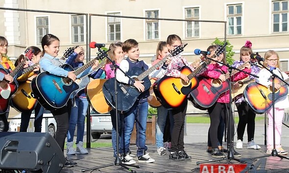 FOTO-VIDEO: Şcoala Altfel. Spectacol cu chitare în Piaţa Cetăţii. Copii din Alba Iulia au interpretat piese de muzică folk