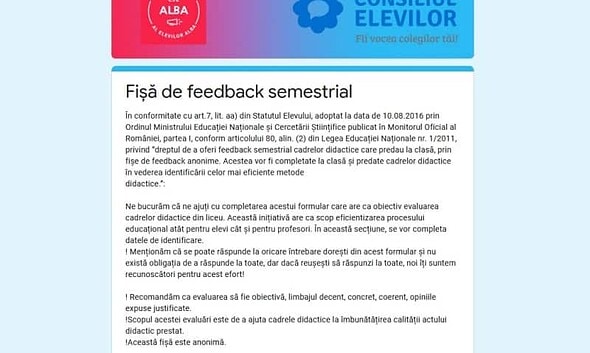 Elevii de liceu din Alba își pot evalua profesorii de la clasă printr-un formular online. Feedback-ul este anonim